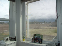 This is the view from were I sit and write. There is an field behind our house. Those gray bumps in the distance are the Rocky Mountains. You can’t see the peaks because of the clouds.